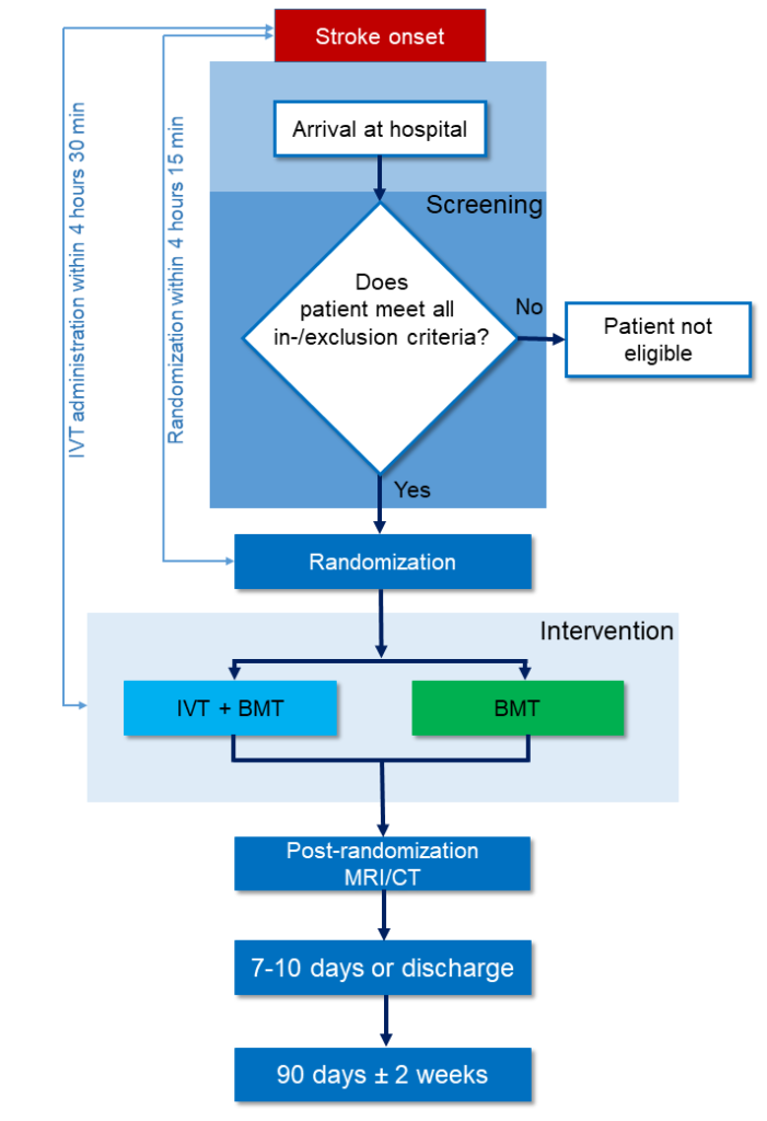 DO-IT is a multicenter, prospective, randomized, open label, blinded endpoint (PROBE) trial with predefined interim analyses. The experimental arm is defined as administration of IVT plus BMT. The standard arm is defined as BMT with no additional study-specific treatment (Figure 2). 906 patients will be randomly assigned to either the standard or the experimental arm with a ratio of 1:1 (453 patients per group).