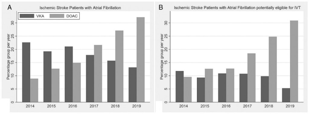 (A) Percentages of patients with atrial fibrillation among all ischemic stroke patients. (B) Percentages of patients with atrial fibrillation within the subgroup of ischemic stroke patients potentially eligible for intravenous thrombolysis. Note the decrease in VKA pretreatment with concomitant rapid increase in DOAC pretreatment in both patient groups. DOACs = direct oral anticoagulants; IVT = intravenous thrombolysis; VKA = vitamin K antagonist.